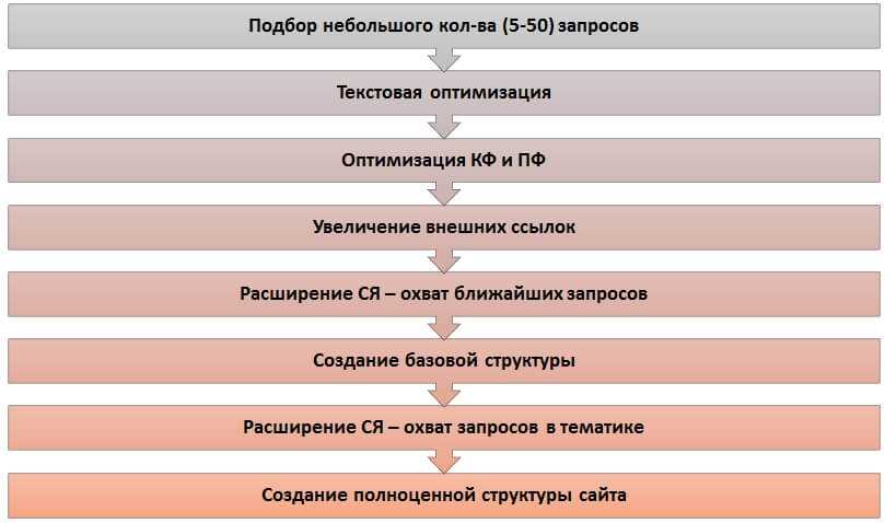 Есть нюансы, которые далее по статье разберем подробно, например, повторение процессов по сбору ключевых запросов или расширение структуры сайта. Наглядная схема процесса: