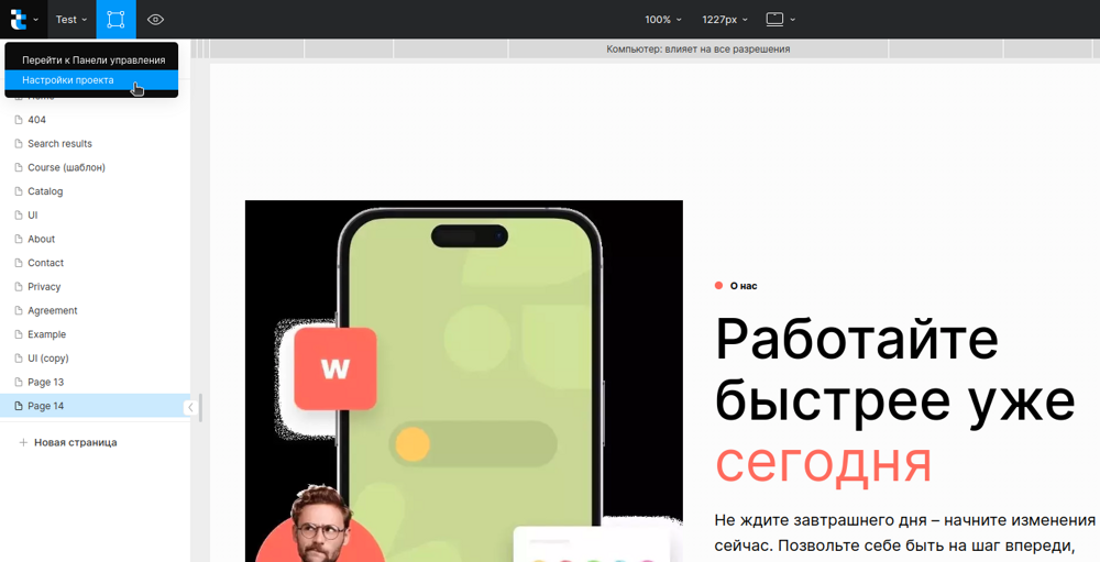 Для редактирования пользовательского кода всего сайта нужно открыть настройки проекта в верхнем меню.