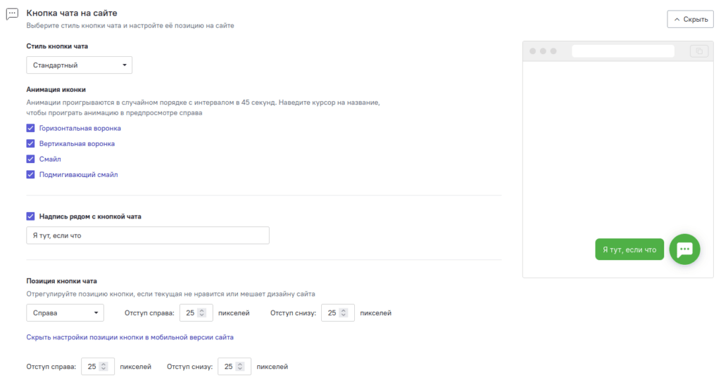 Мне понравилась современность и интерактивность виджета. Правда, по сути, есть один вариант отображения кнопки чата, только иконку можно поменять на свою. А для мобильных только изменить отступ:
