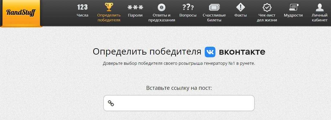 - RandomPromo. Ресурс подводит итог среди пользователей, которые сделали репост или вступили в группу, поставили лайк под публикацией. После завершения выбора победителя генерируется ссылка для размещения.