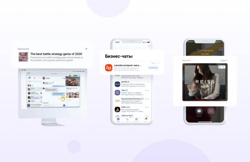 Показывать рекламные объявления можно на экране чатов, звонков, «Еще», «Интересное», бизнес-чатов и десктопной версии – размещения нативны, не отвлекают пользователей от мессенджера, но в то же время привлекают внимание и вовлекают – например, средний CTR в объявлениях среди бизнес-чатов составляет 9,8%.