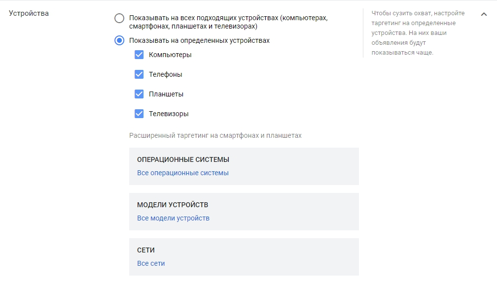 Здесь вы можете указать даже отдельные модели телефонов, планшетов, операционных систем. Это позволит сэкономить бюджет, если ваше предложение, например, подходит только для пользователей iOs или владельцев компьютеров.