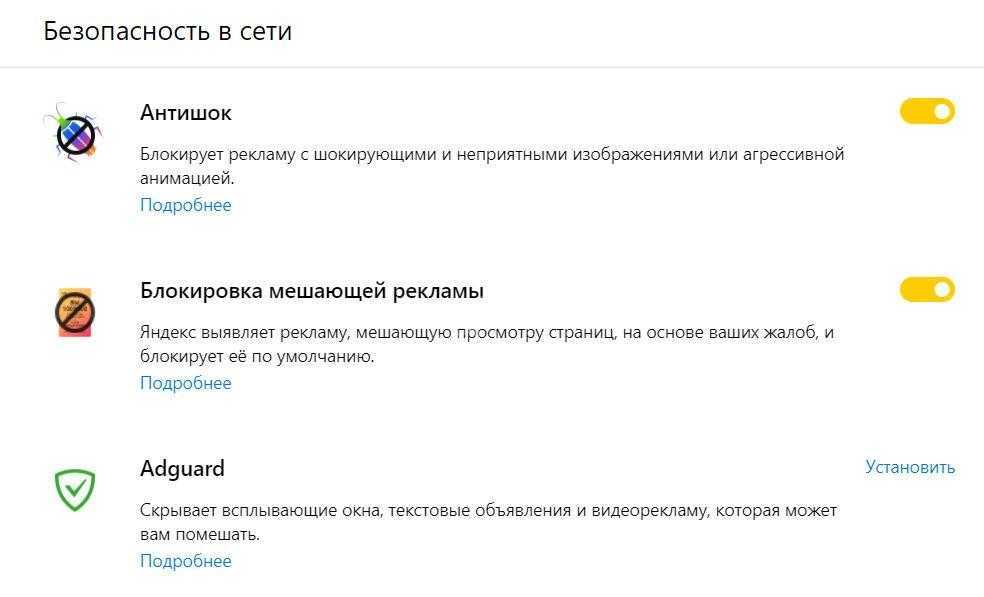 - Просмотрите список расширений (надстроек), в Яндексе те, что связаны с рекламой, выделены в отдельный подраздел, их легко включать и отключать;