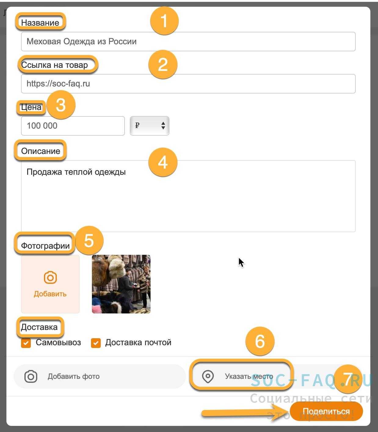 - заполняем открывшееся окно, прописывая название товара/услуги, его цену, способ доставки.