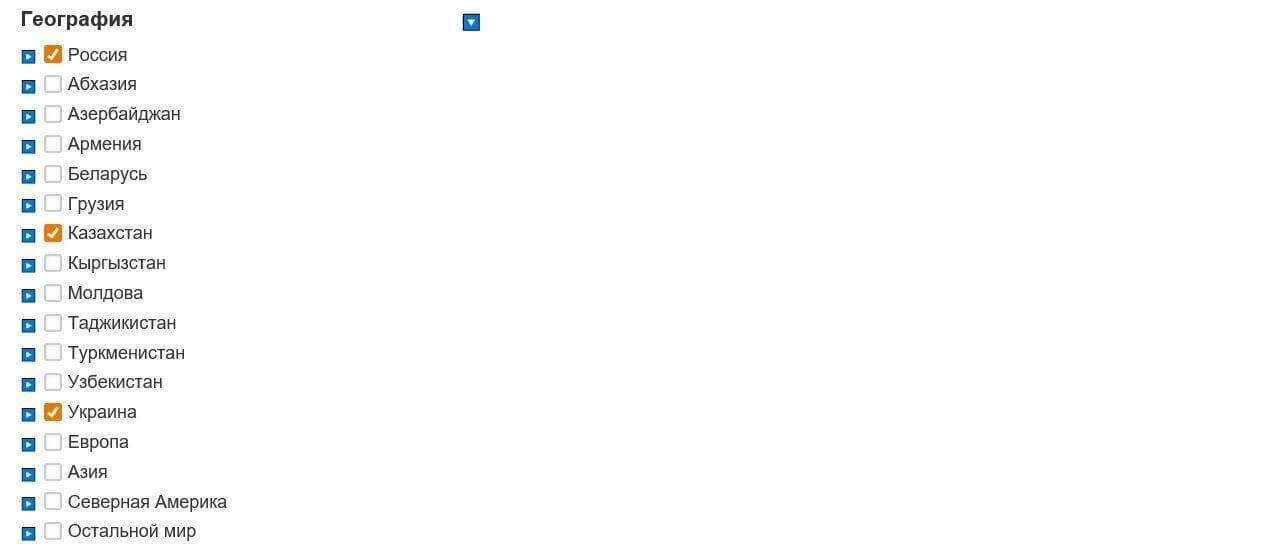 Шаг 9. Укажите геолокацию показов. Например, вы осуществляете доставку товара по России, Украине и Казахстану — выберите эти регионы.
