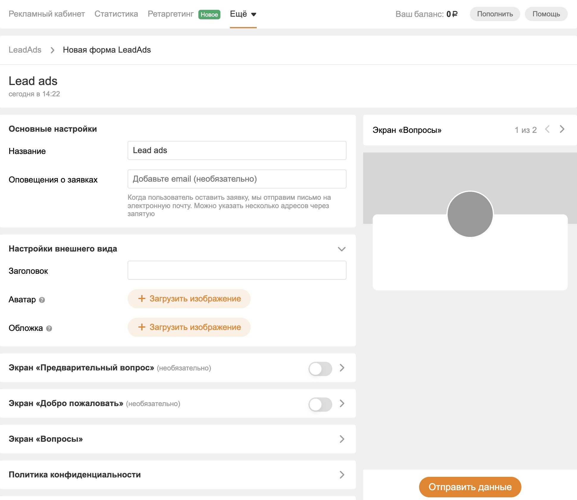 LeadAds – это форма, позволяющая собирать контакты потенциальных клиентов в ОК. Форма создается просто и настраивается под разные задачи. Анкету можно добавить в рекламную публикацию, тогда при клике на кнопку пользователь сможет заполнить форму обратной связи.