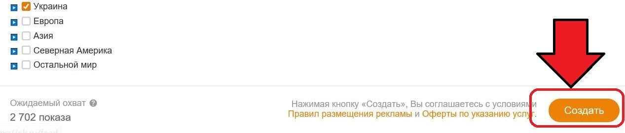 Шаг 10. Выбрав необходимые параметры, нажмите под списком справа «Создать». Слева же вы увидите ожидаемый охват — предполагаемое количество людей, которые увидят рекламу (зависит от настроек и бюджета).