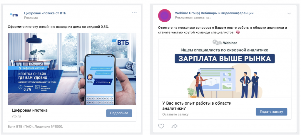 Такой формат предполагает минимум текста, информативную картинку и кнопку с призывом к действию. Формат подходит для разных целей и часто используется для привлечения трафика на сайт, в сообщество или сбора заявок и целевых звонков.