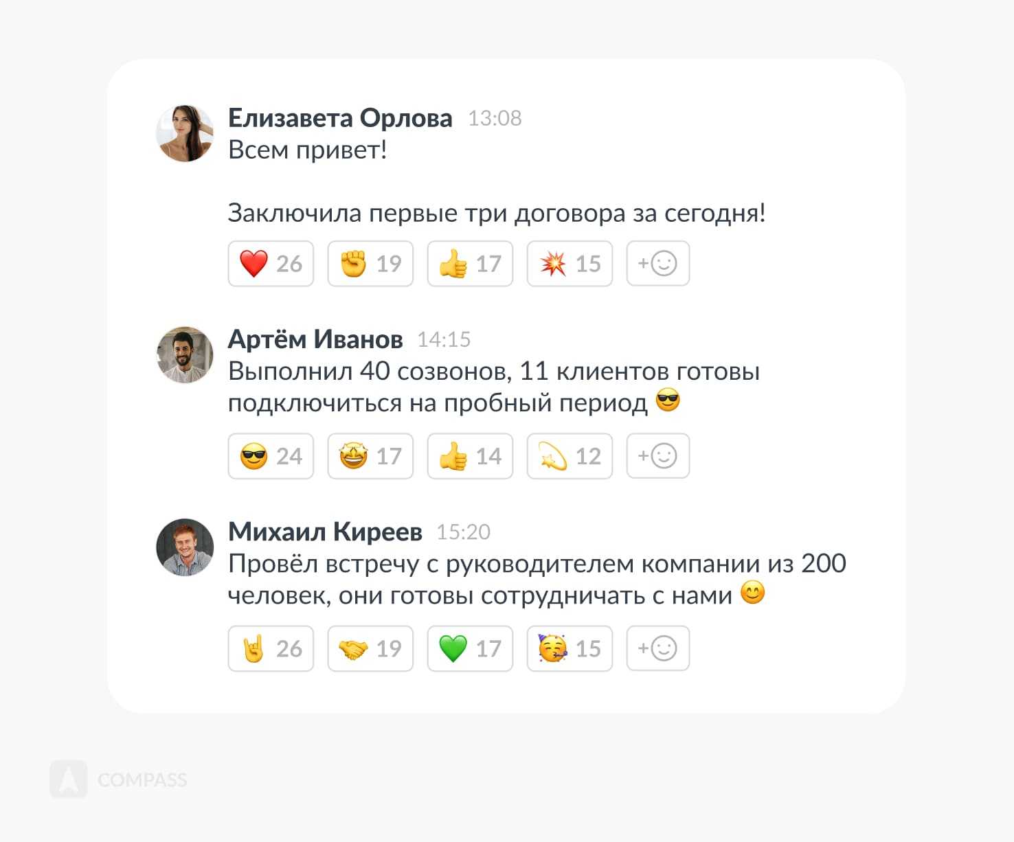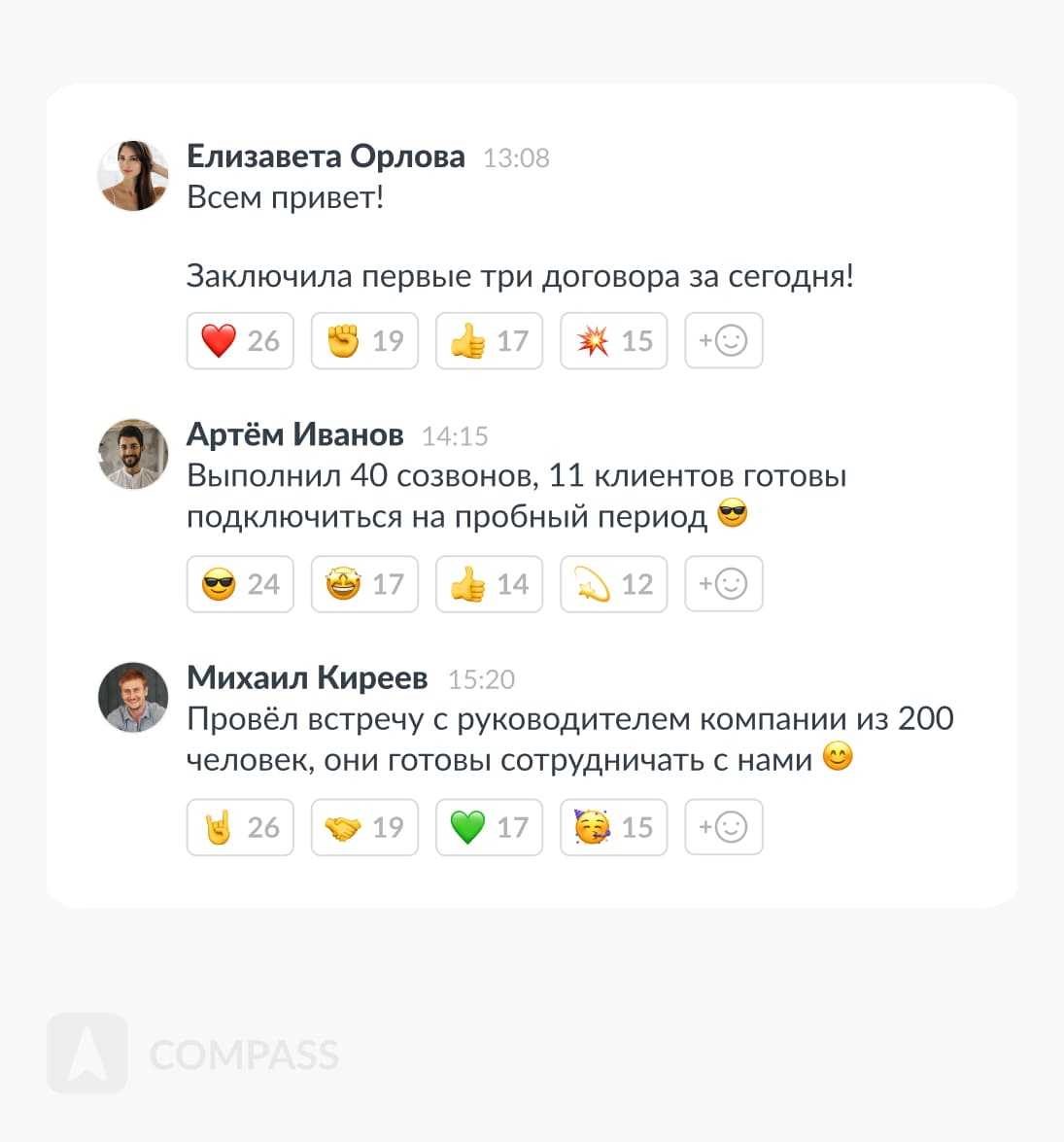 Сообщения о действиях коллег бодрят и задают высокий темп работы всему коллективу. Сотрудники могут сравнить себя с коллегами и «подтянуть» количество своих «продающих» действий, если окажется, что они сильно отстают.