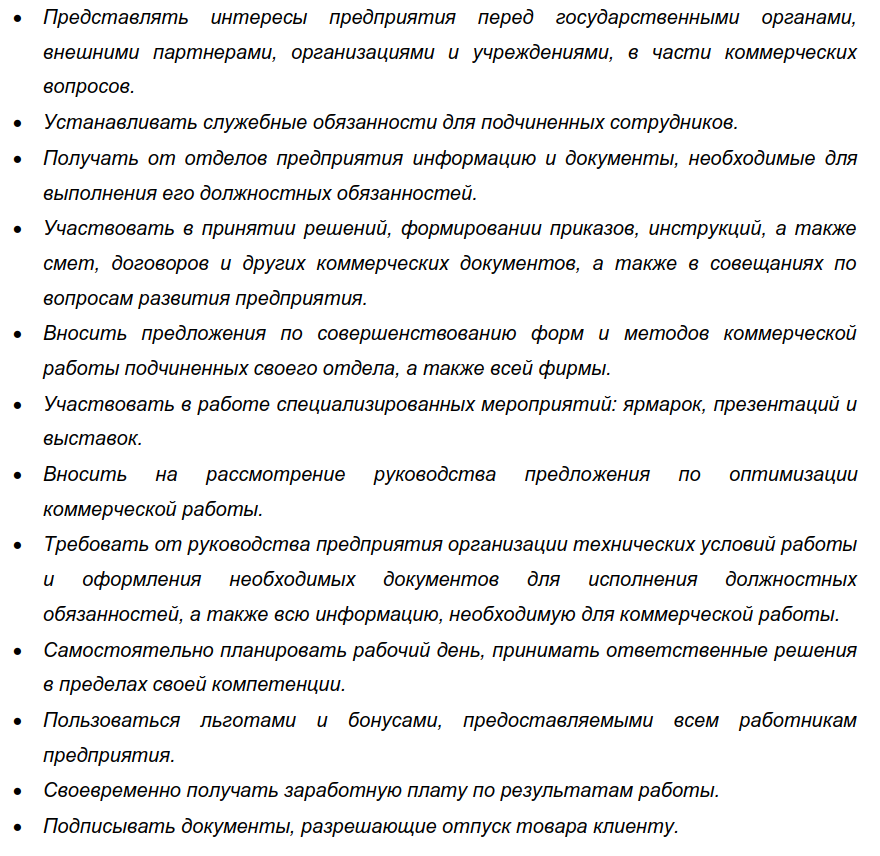 На руководителя сбыта, как и на любого сотрудника, распространяются права и гарантии, предусмотренные для работников Трудовым кодексом. Кроме этого, он обычно наделяется следующими правами: