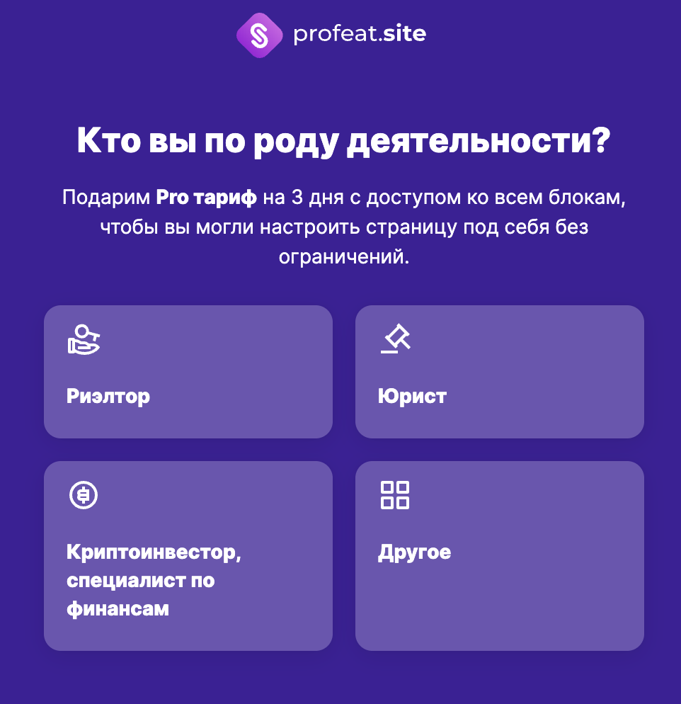 Profeat.Site — конструктор одностраничников. Это визуальный редактор и готовые шаблоны. С ним создать новую страницу максимально просто. Более того, разработка превращается в захватывающий пошаговый процесс. Теперь подробнее: