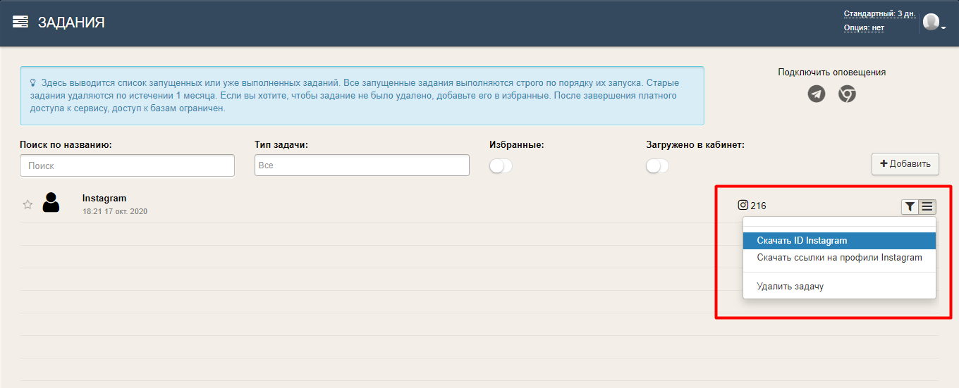 - В заданиях находим свой отчет, жмем на иконку с тремя горизонтальными полосками и выбираем «Скачать ID Instagram».