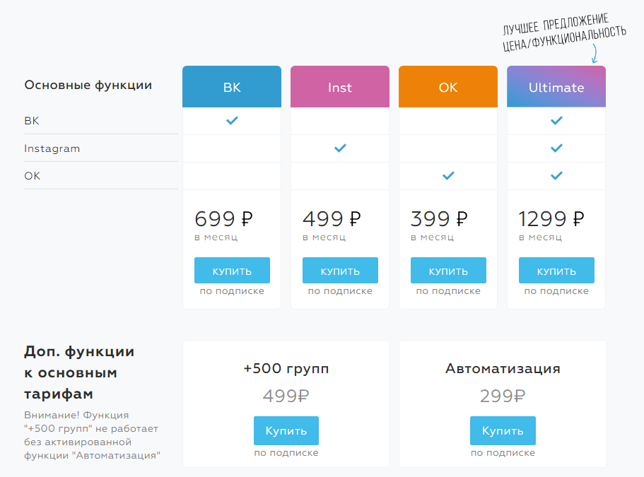 - возможность добавлять в сервис от 3-х до 30 инста-аккаунтов в зависимости от выбранного плана;