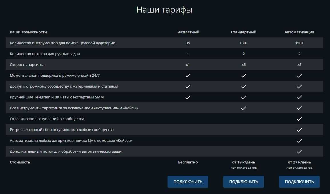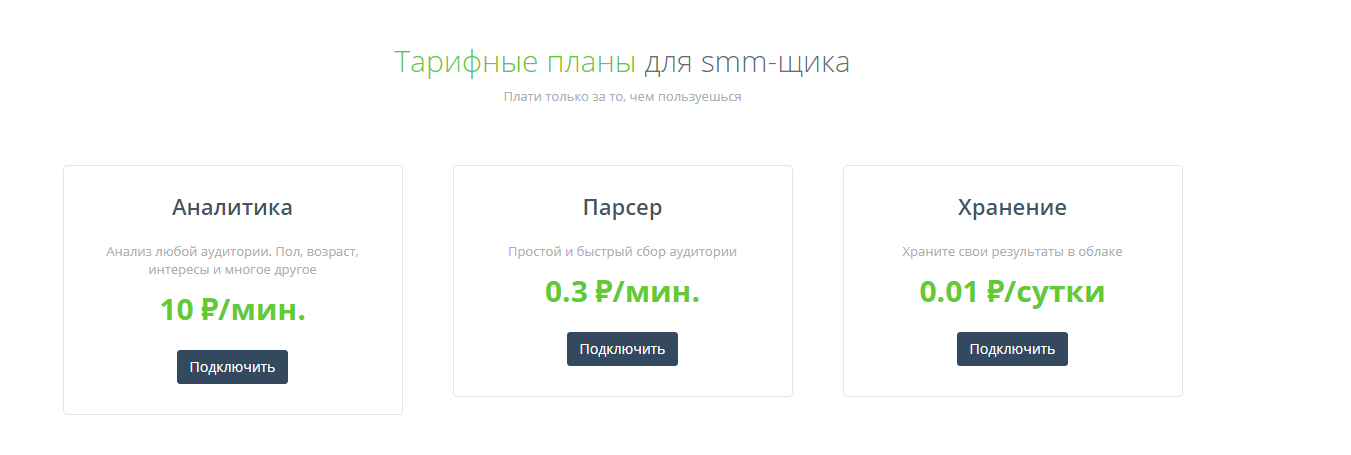 Один из старейших парсеров, которым пользуются сотни специалистов. По возможностям почти не уступает «ТаргетХантер». Но автоматическая загрузка в рекламный кабинет новых подписчиков определённых групп всё-таки решает.