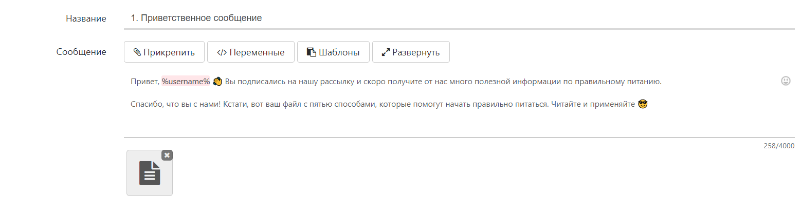 Если вы выбрали имя пользователя, каждому подписчику рассылки придет персонализированное сообщение с персональным обращением: