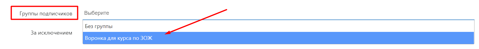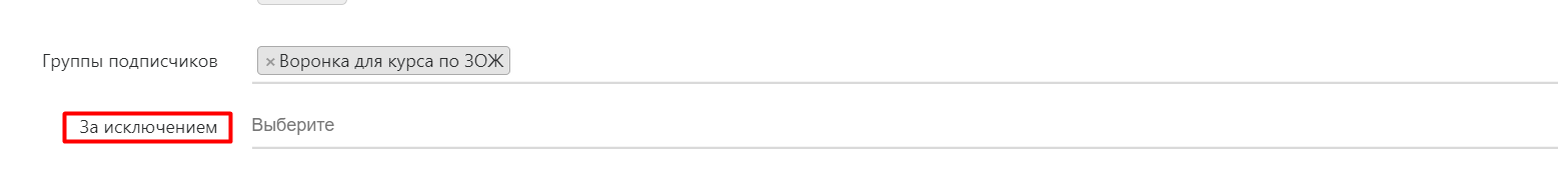 При активности нескольких групп подписчиков (рассылок) можно дополнительно исключить группы, для которых это автосообщение не релевантно. Для этого кликните по полю «За исключением»: