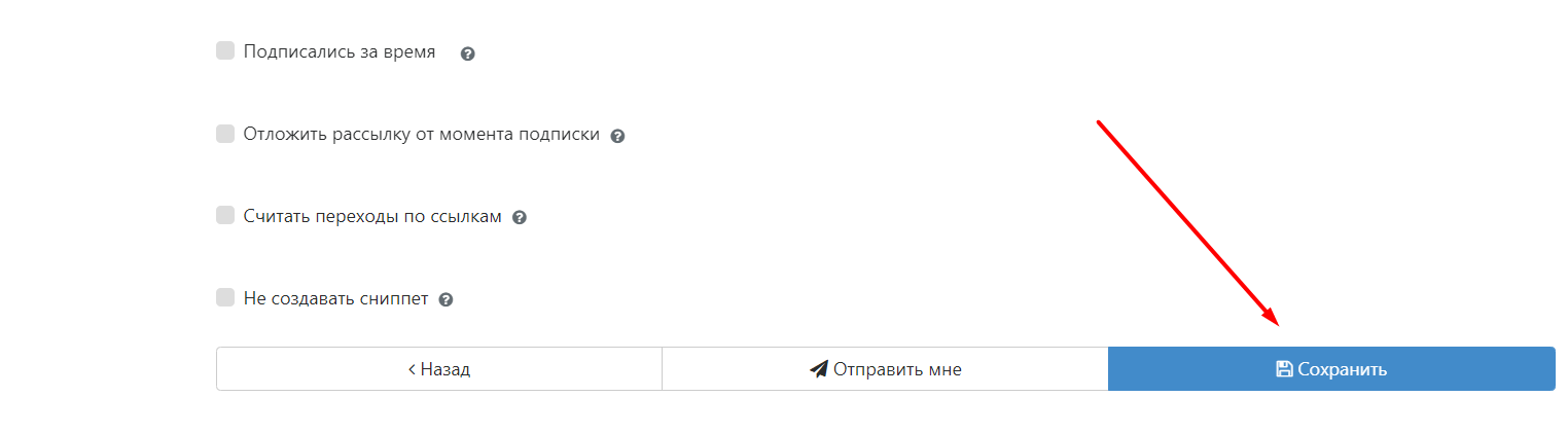 Определяемся с группой подписчиков, устанавливаем дату. Проставляем галочки напротив пунктов «Считать переходы по ссылкам» и «Не создавать сниппет». Жмем кнопку «Сохранить».