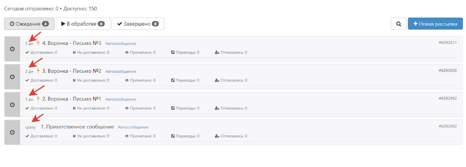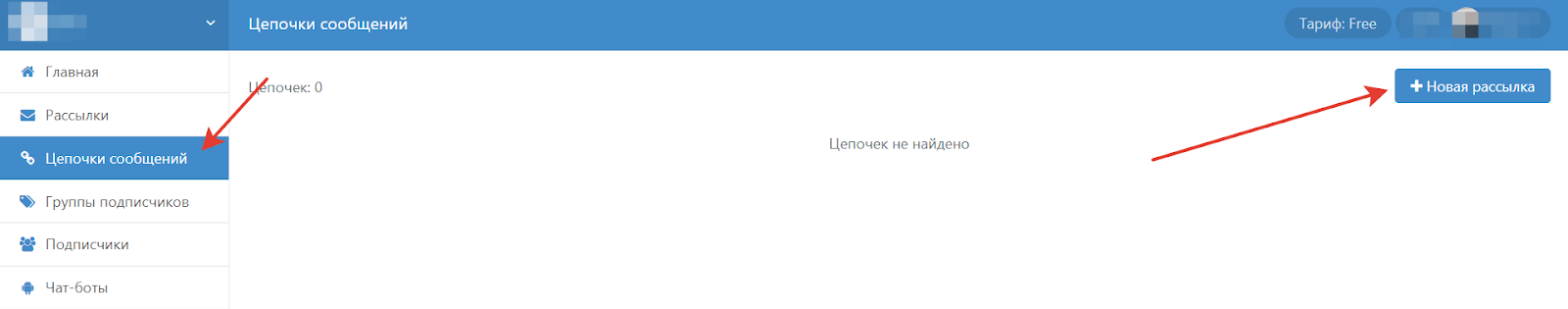 Чтобы создать первое сообщение, перейдите в раздел «Цепочки сообщений» и нажмите «Новая рассылка»: