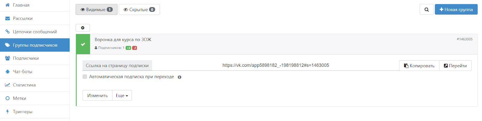 После создания группа подписчиков отобразится в интерфейсе Senler, где при необходимости ее можно отредактировать.