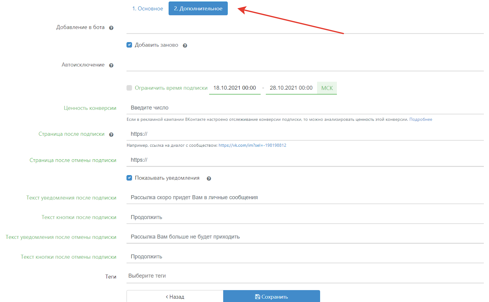 Дополнительные опции могут быть полезны, если нужно создать более узконаправленную рассылку. Рассмотрим, какие дополнения бывают и для чего они нужны.