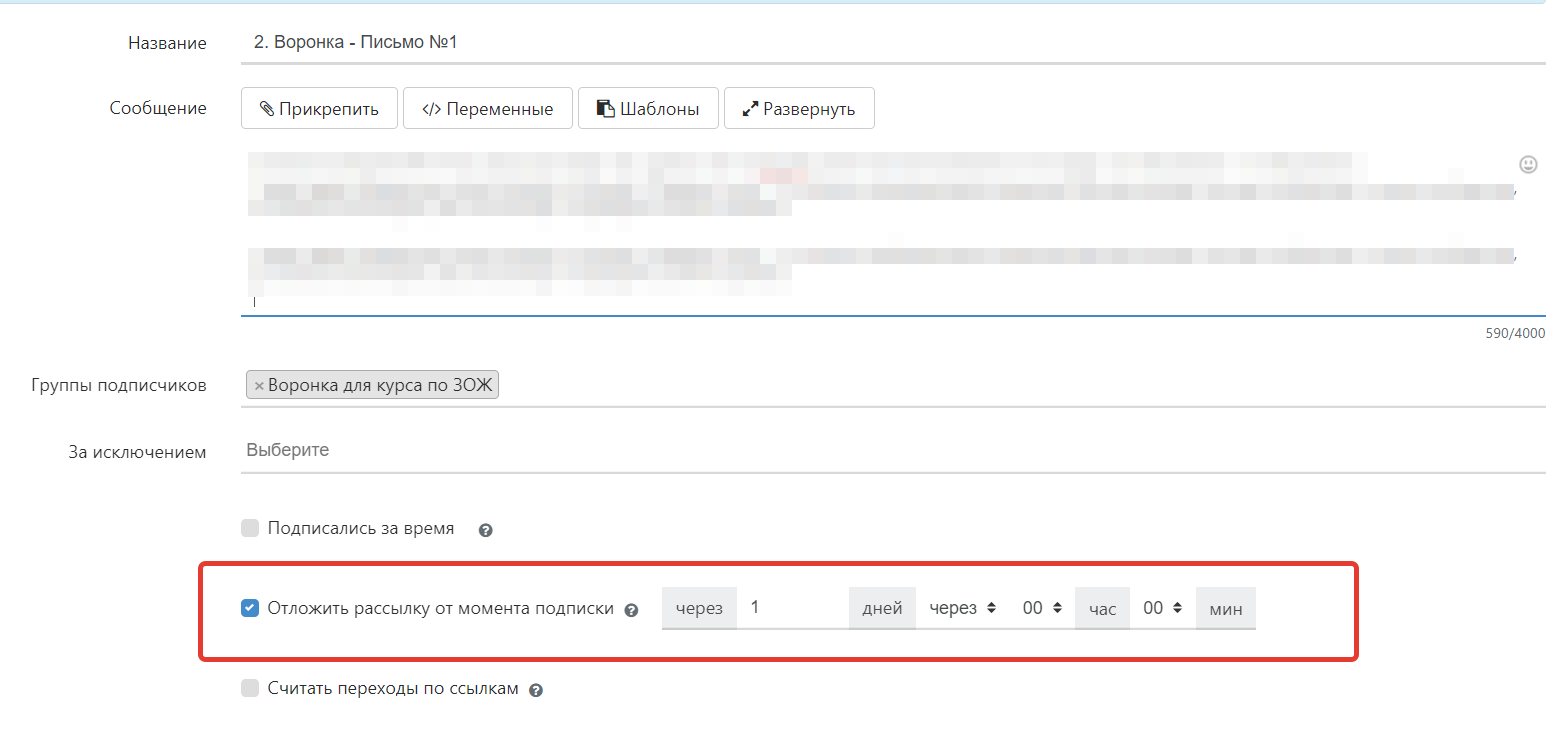 Важный момент! Чтобы подписчики получили сообщение не сразу после подписки, а спустя некоторое время, активируйте опцию «Отложить рассылку от момента подписки» и укажите временной интервал: