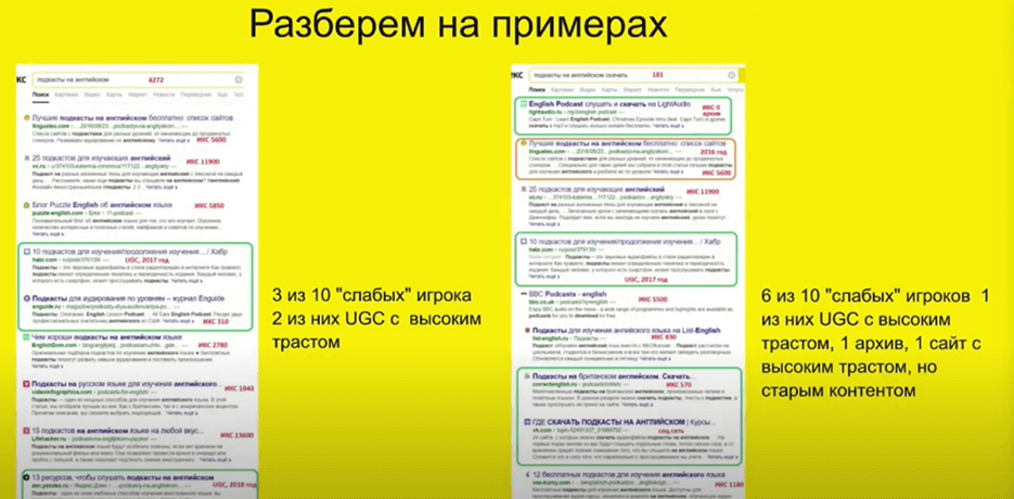 Дальше Елена проанализировала менее частотный запрос «Скачать подкасты на английском». Здесь уже ситуация интереснее. На первом месте видим сайт с нулевым индексом, это сайт-однодневка, который потом пропадет. Слабых игроков с user-generated контент больше, также здесь есть старый контент. Поэтому выбирая тему по подкастам, Елена рекомендует сделать упор именно на связке «скачать». А на самой странице нужно показать, где мы можем это сделать.