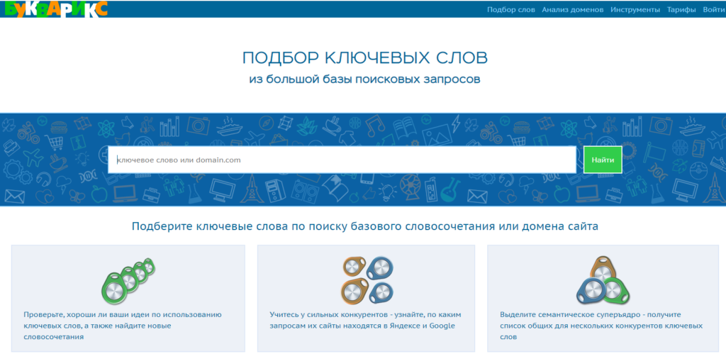 Букварикс, Serpstat, Keyword Tool, SpyWords, Keys.so, Semrush, Coolakov. |