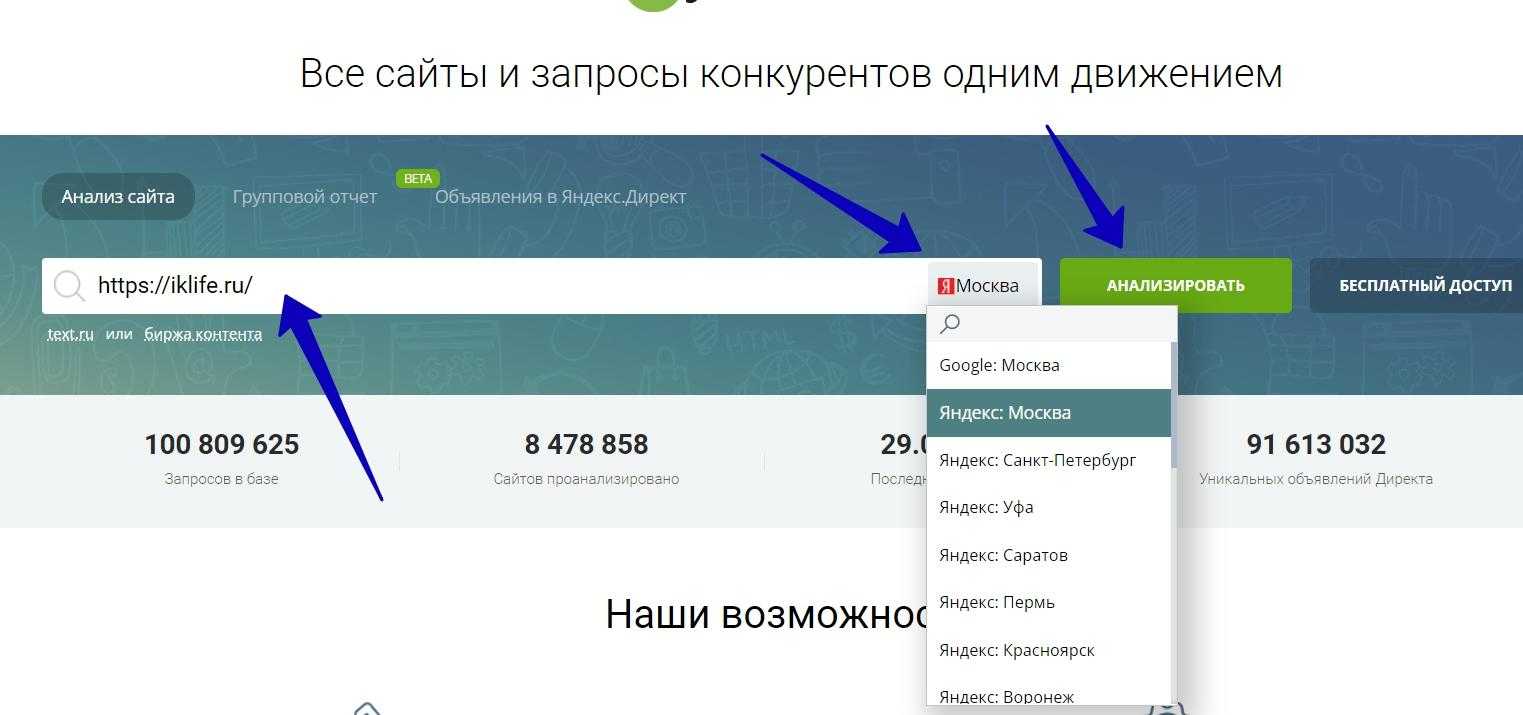 Можно выбрать регион, например, Москва и нажать кнопку «Анализировать». Сервис за несколько секунд сделает анализ и покажет данные конкурента: