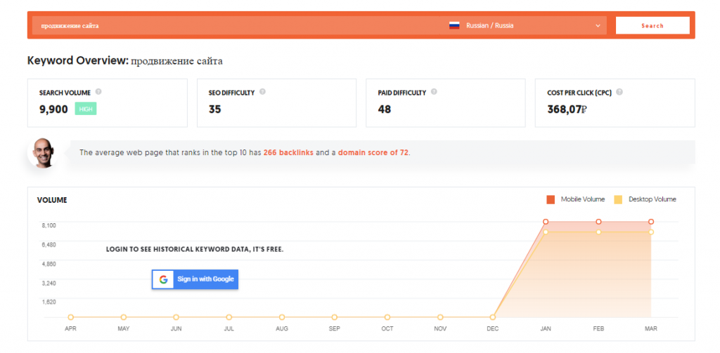 Сервис определяет объем запросов по каждому ключу и составляет прогноз популярности слова в будущем. Имеет систему рекомендаций, помогающую определить слова, которые помогут обойти сайты конкурентов.