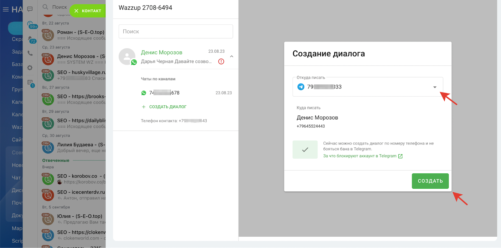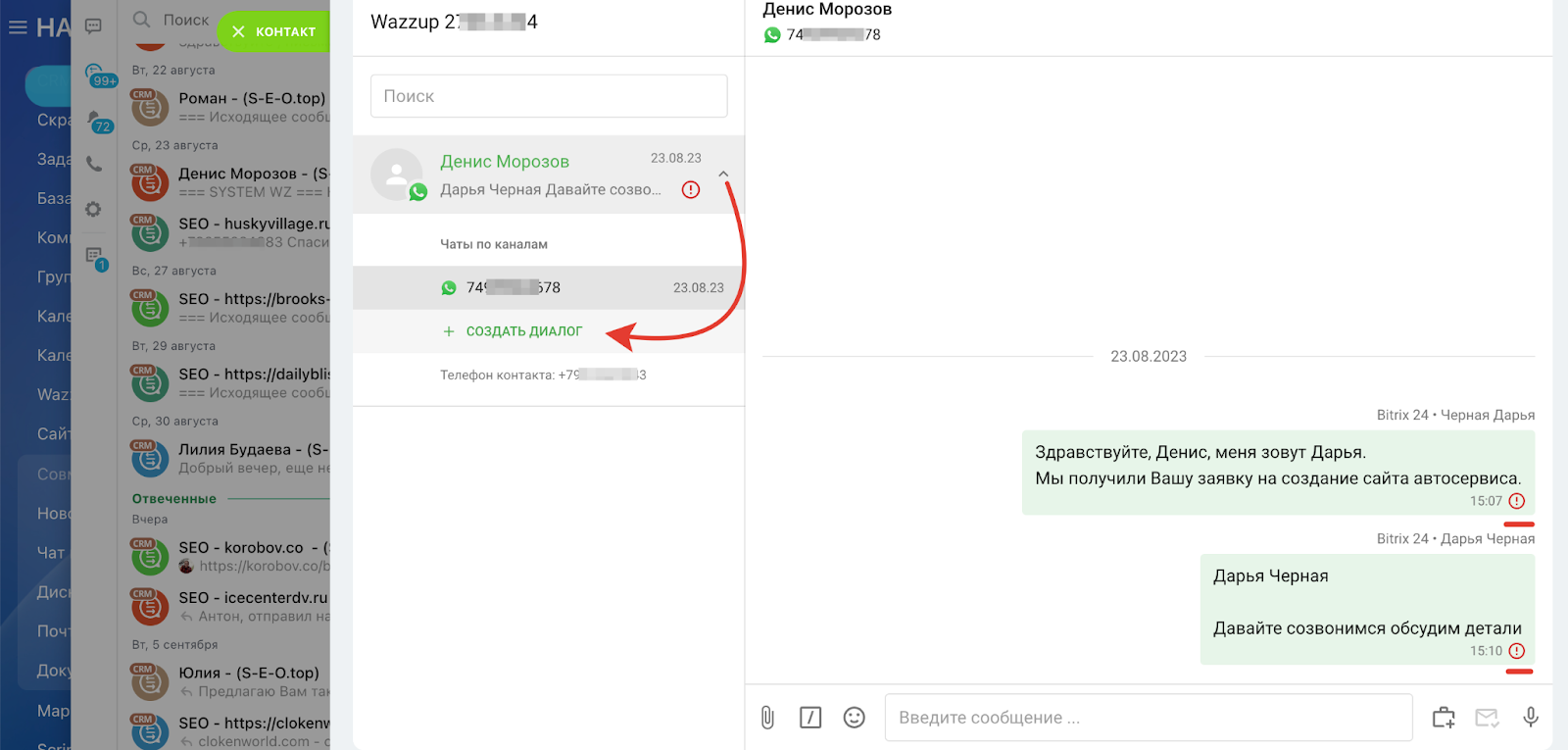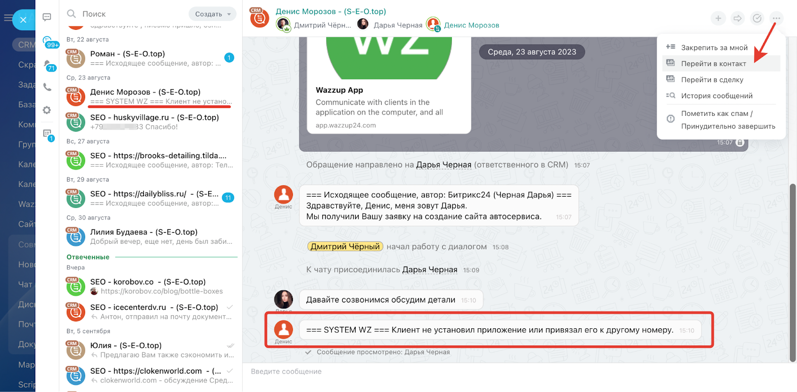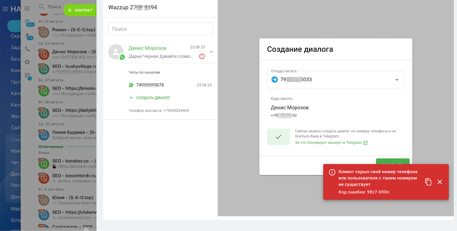 Если Вам нужно связаться с клиентом в мессенджере, но у него не установлен WhatsApp, то система предупредит об этом. В этом случае можно использовать альтернативный способ связи.