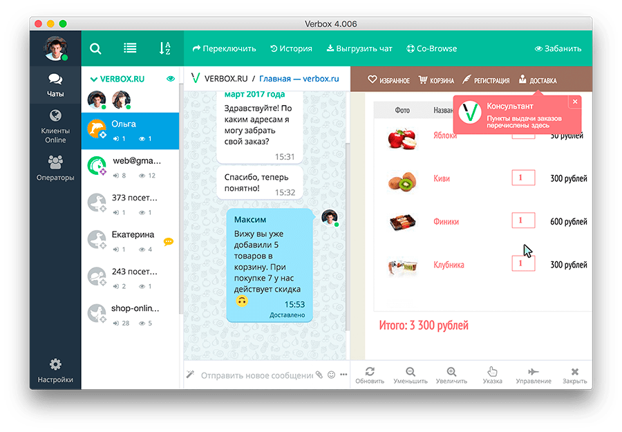 ДиалогДиалогПри переходе в Co-browse можно продолжить переписку с клиентом. Для этого не нужно заново открывать диалог или переходить в другие вкладки.Просматриваемая страницаПросматриваемая страницаЗная, на какие страницы заходит клиент, можно сориентировать его в выборе товара или помочь в поиске интересующей информации.Наблюдение за поведением посетителяНаблюдение за поведением посетителяНаблюдая за поведением посетителя на сайте, менеджер может помочь с выбором покупки, подсказать, как оформить заказ и предложить сопутствующий товар.УказкаУказкаНе тратьте время на объяснения – с помощью указки покажите клиенту интересующие его элементы.Перехват управленияПерехват управленияПроведите клиента по разделам сайта, заполните форму, добавьте товар в корзину. Больше не нужно по шагам тыкать клиенту указкой. Возьмите мышь клиента в свои руки!Заполненные поляЗаполненные поляПокажем все формы и поля, которые заполняет посетитель. Вы можете быстро помочь клиенту, если он пропустил поле или не смог указать корректную информацию.Движение и клики мышиДвижение и клики мышиПокажем все движения мыши и клики посетителя. Можно увидеть ошибки сайта и предложить помощь, если посетитель «потерялся».
