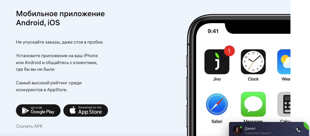 - Интеграция с Avito, что позволяет получать сообщения с магазина в приложение JivoSite;