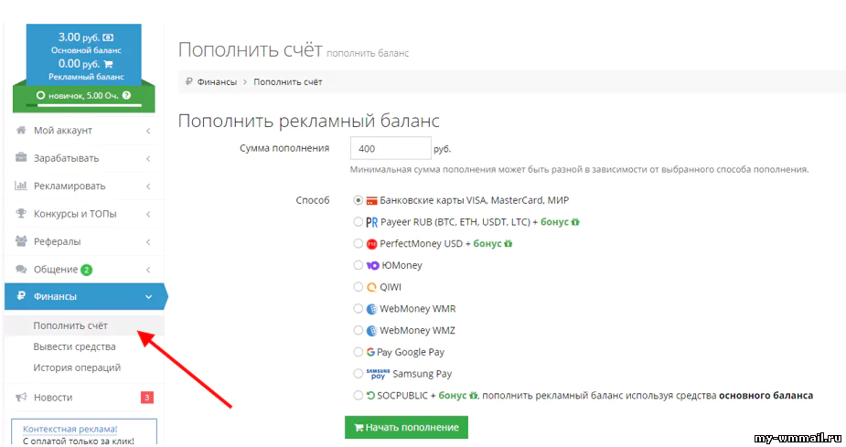 Букс Соцпаблик – старичок в своей нише, только несколько лет назад его обновили. Тут свыше 125 000 активных пользователей, есть мобильное приложение и много способов пополнения. Первым делом рекламодателю предстоит внести деньги на внутренний счет. Делается это через раздел с финансами: