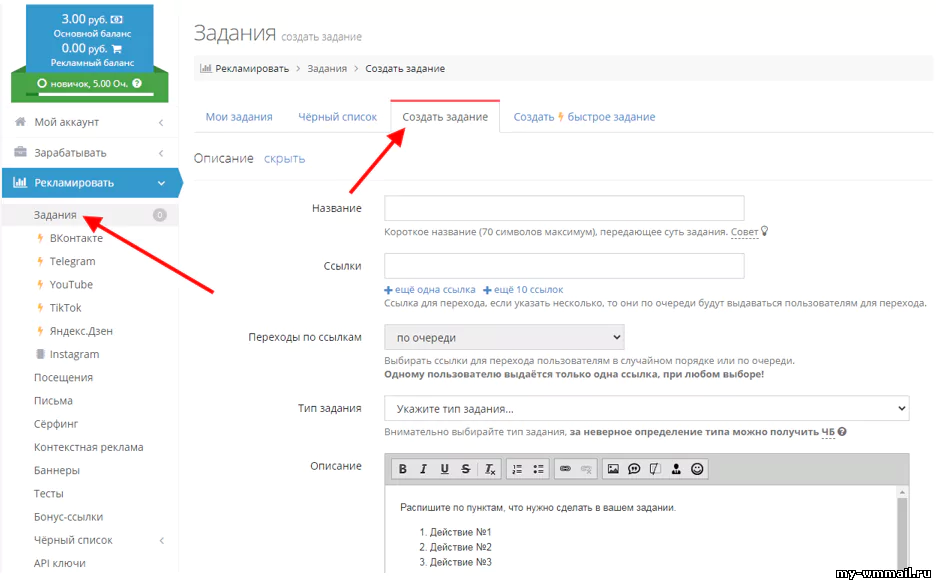 Вносишь средства, потом жмёшь кнопку Рекламировать и выбираешь задания. Там появится вкладка, чтобы добавить новое, после чего сразу же открывается форма для заказчика:
