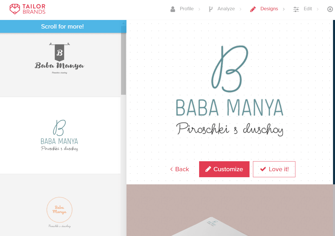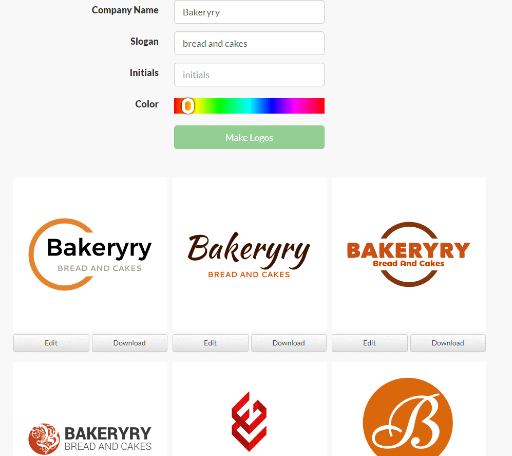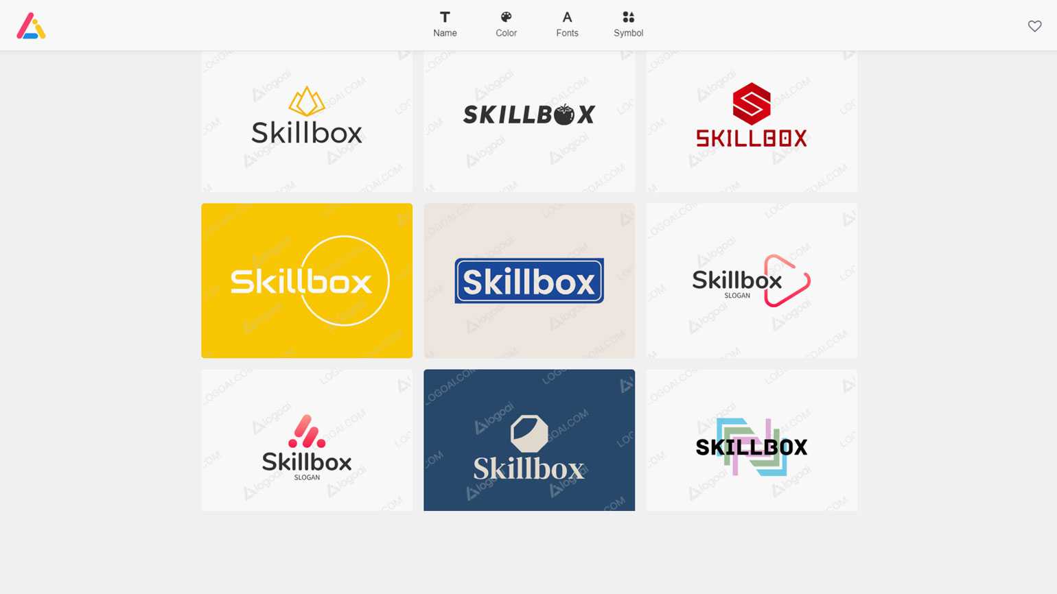 Здесь с вариантами помогает система. Вы вводите название и слоган по желанию, выбираете цветовую гамму и смотрите готовые. Лучше справляется с латиницей.