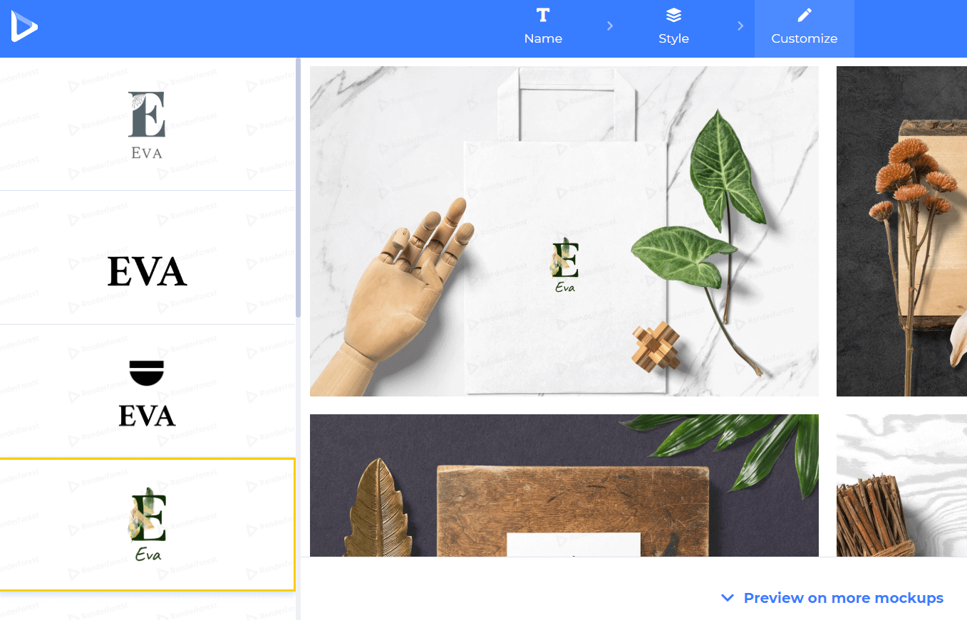 Плюсы. Поддерживает кириллицу, предлагает много мокапов для предпросмотра логотипа. Можно оплачивать в рублях.