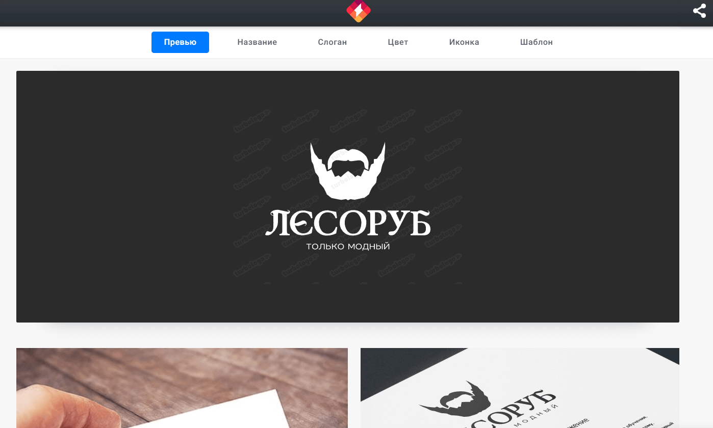 Как работает. Сервис работает по тому же принципу: надо выбрать сферу деятельности, цвета, иконки, ввести название и слоган — и появятся разные варианты. Их можно посмотреть на мокапах и отредактировать.