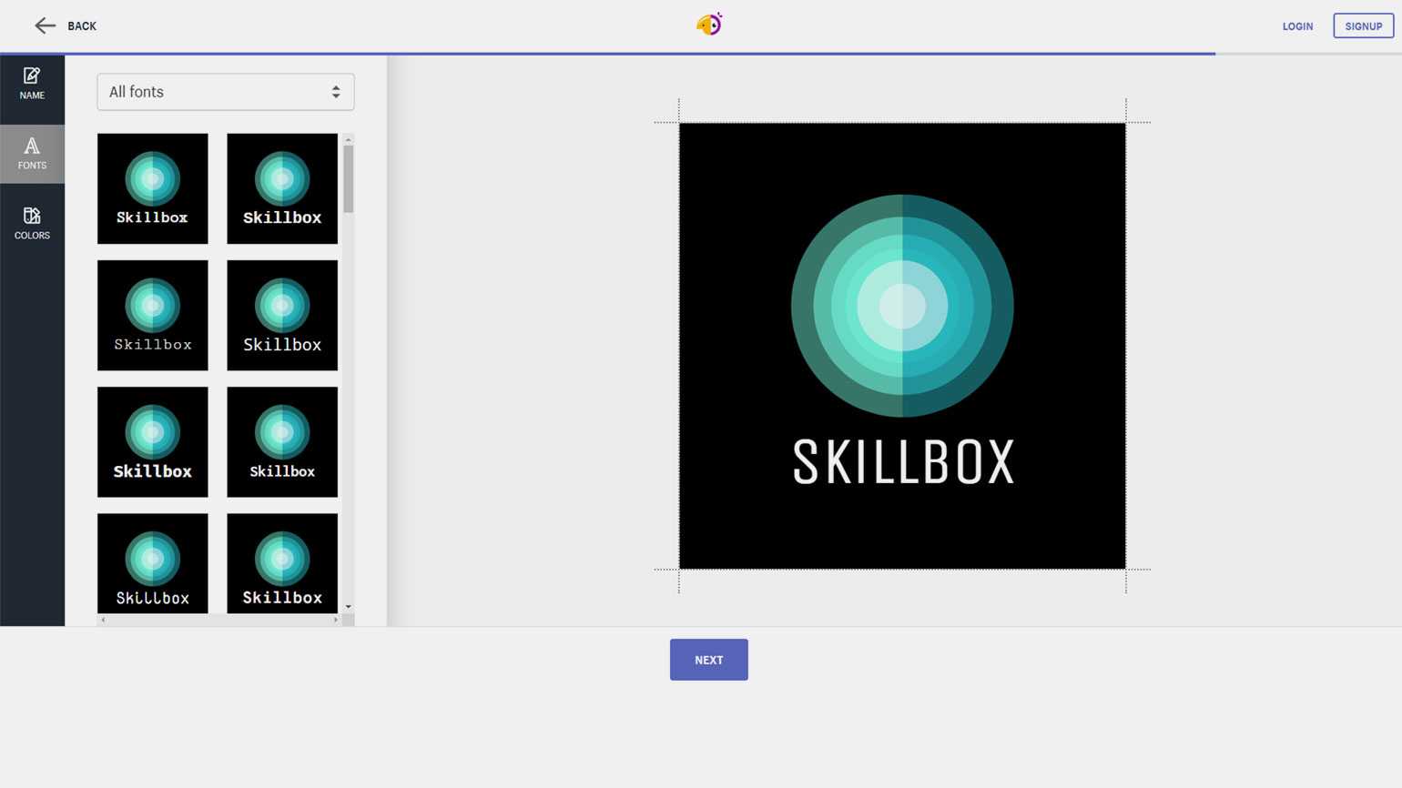 Как работает. Пользователю нужно ввести название компании, выбрать сферу, цветовую гамму и характер шрифтов. Вводить название нужно на английском, иначе сервис просто зависнет на этапе генерации.