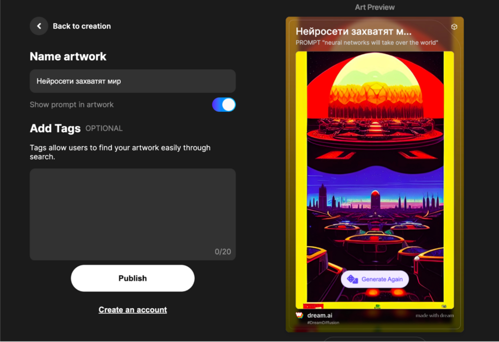 Нейросеть Dream by WOMBO создает картинки по заданным с помощью текста и настроек параметрам. Программа бесплатно генерирует абстрактные картинки. Чтобы получить изображение, просто напишите слово или фразу и выберите стиль.