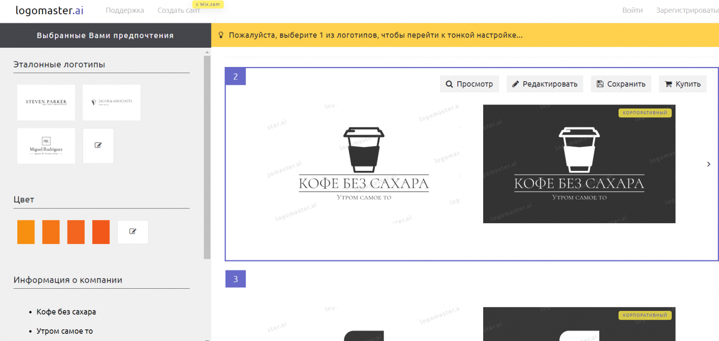 Конструктор от платформы для создания сайтов Wix, позволяет настроить рекомендации по тематике и предпочтениям, выбрать готовый лого и отредактировать его.