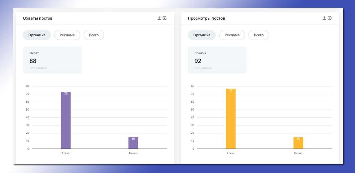 Количество пользователей, которые увидели посты аккаунта, а также общее число просмотров постов по дням
