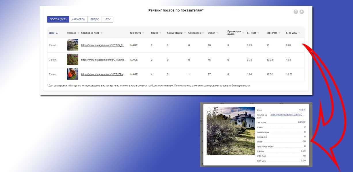 И можно найти сводную таблицу со статистикой публикаций в Инстаграме по каждому посту