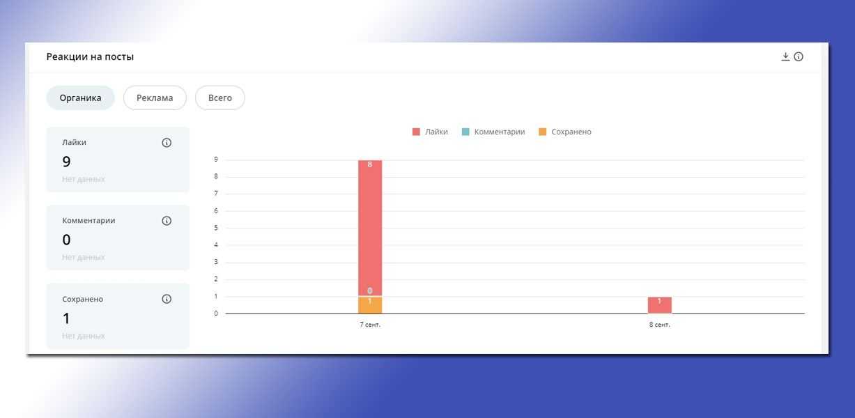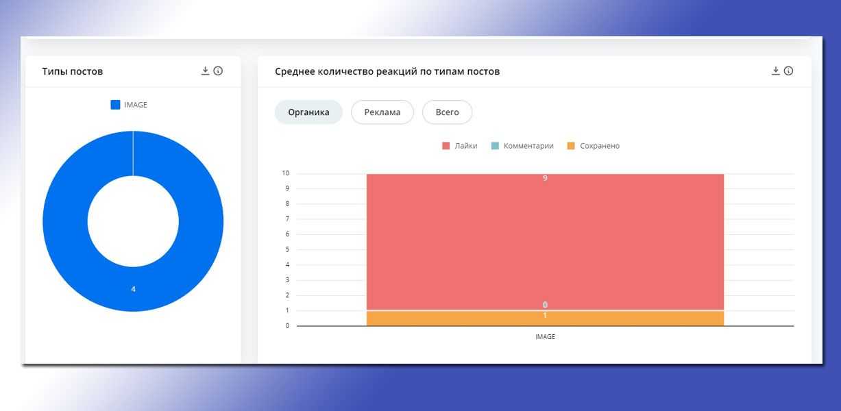 По метрике «Типы постов» вы наглядно увидите соотношение публикаций с различным типом контента: с фото, видео и т. д. В соседней метрике можно увидеть анализ количества реакций за весь выбранный период: на все публикации с фото, на все с видео и т. д. Отдельно можно посмотреть рекламные посты. При нажатии на разноцветные квадратики убирается или добавляется соответствующий раздел на графике: например, если вас не интересует статистика комментариев в публикациях в Инстаграме, значит, удалите их из общего графика.