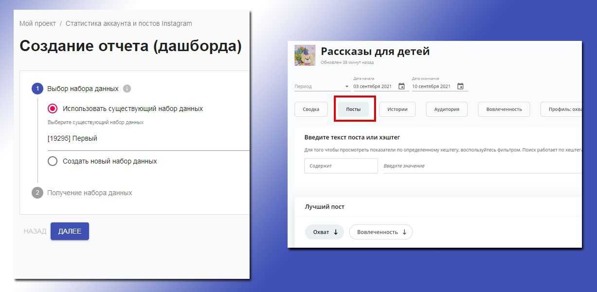 В сервисе DataFan можно создавать дашборды со статистикой соцсети как через сам сервис непосредственно, так и через Google Data Studio. Мы создадим через DataFan, поэтому выберем соответствующий вариант отчета (в графе «Инструмент» – DataFan).