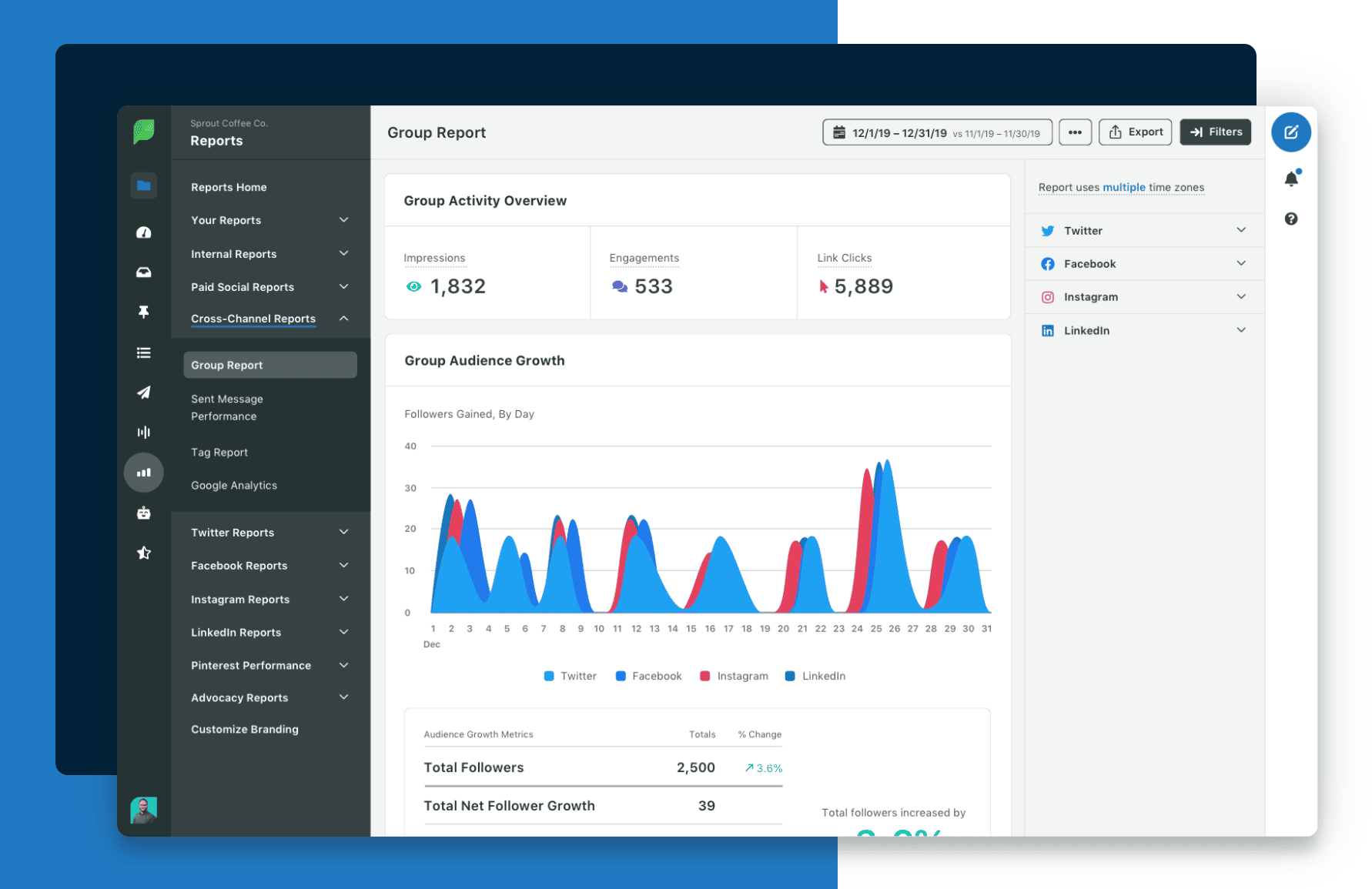 - Its exhaustive analytics and reporting functionality allows you to track your audience growth, impressions, post engagement and link clicks across all channels in one place.
