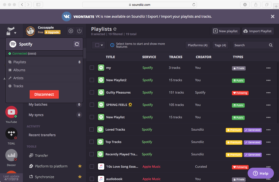 Soundiiz дружит с огромным количеством музыкальных платформ, между которыми можно перекидывать плейлисты. Принцип точно такой же, как и в Tune My Music.