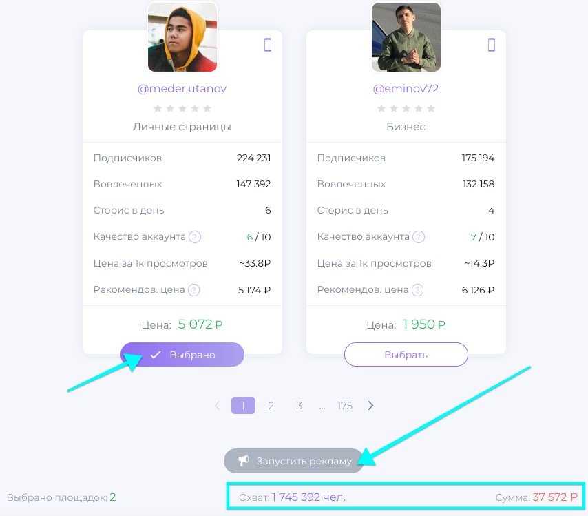 Если выбранных блогеров слишком много или цена рекламной кампании не укладывается в бюджет, можно нажать на “Выбрать всех на странице”, тогда часть уйдет. Либо можно продолжить регулировать настройки фильтра, пока цена не окажется приемлемой.