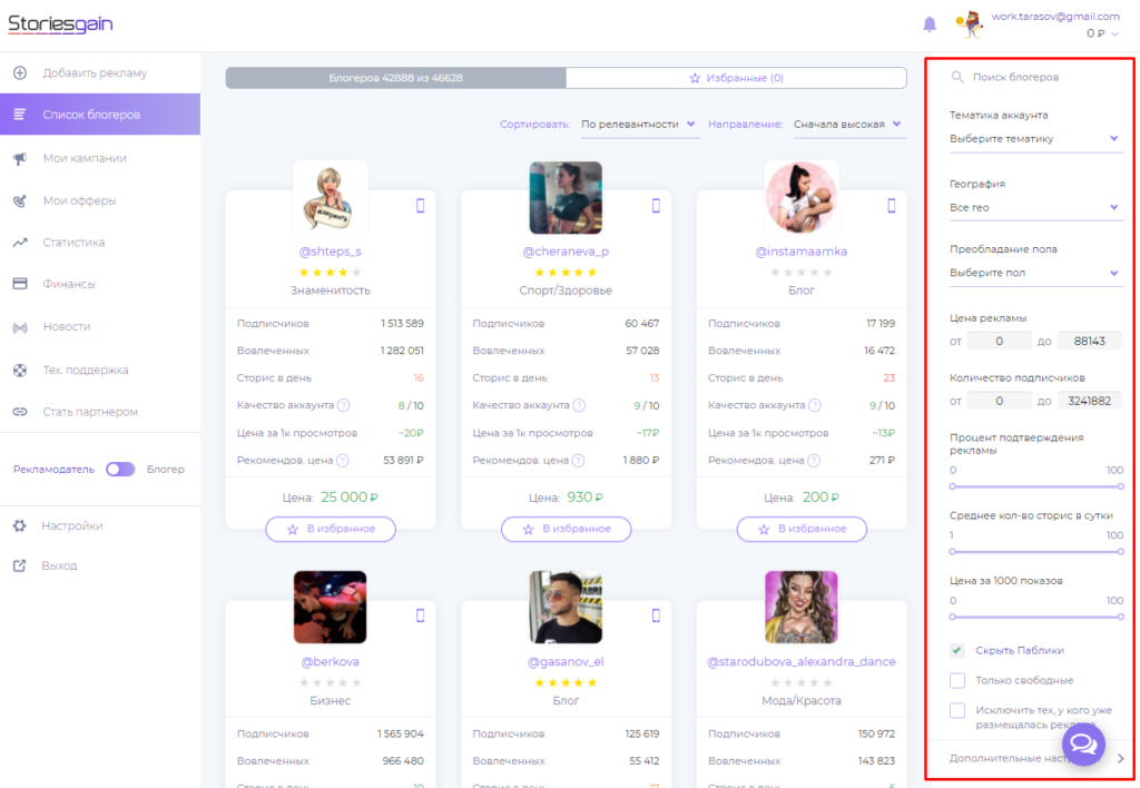 Блогеров можно фильтровать тематике, городам, стоимости и другим критериям.