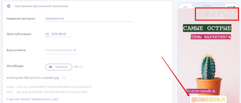 Если вы хотите создать рекламное объявление самостоятельно, то это можно сделать сразу в личном кабинете в онлайн-редакторе Storiesgain.