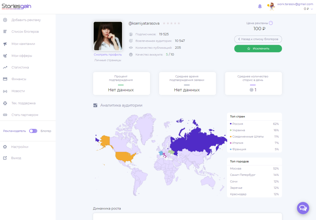 Выбор блогера можно осуществлять двумя способами. Либо вам достаточно той информации, что содержится в карточке блогера, а это число подписчиков и вовлечённых подписчиков, число историй в день, автоматический просчёт стоимости публикации и CMP, а также встроенный анализатор качества блогера, который работает достаточно неплохо, особенно на массовых посевах, значительно снижая время на выбор.
